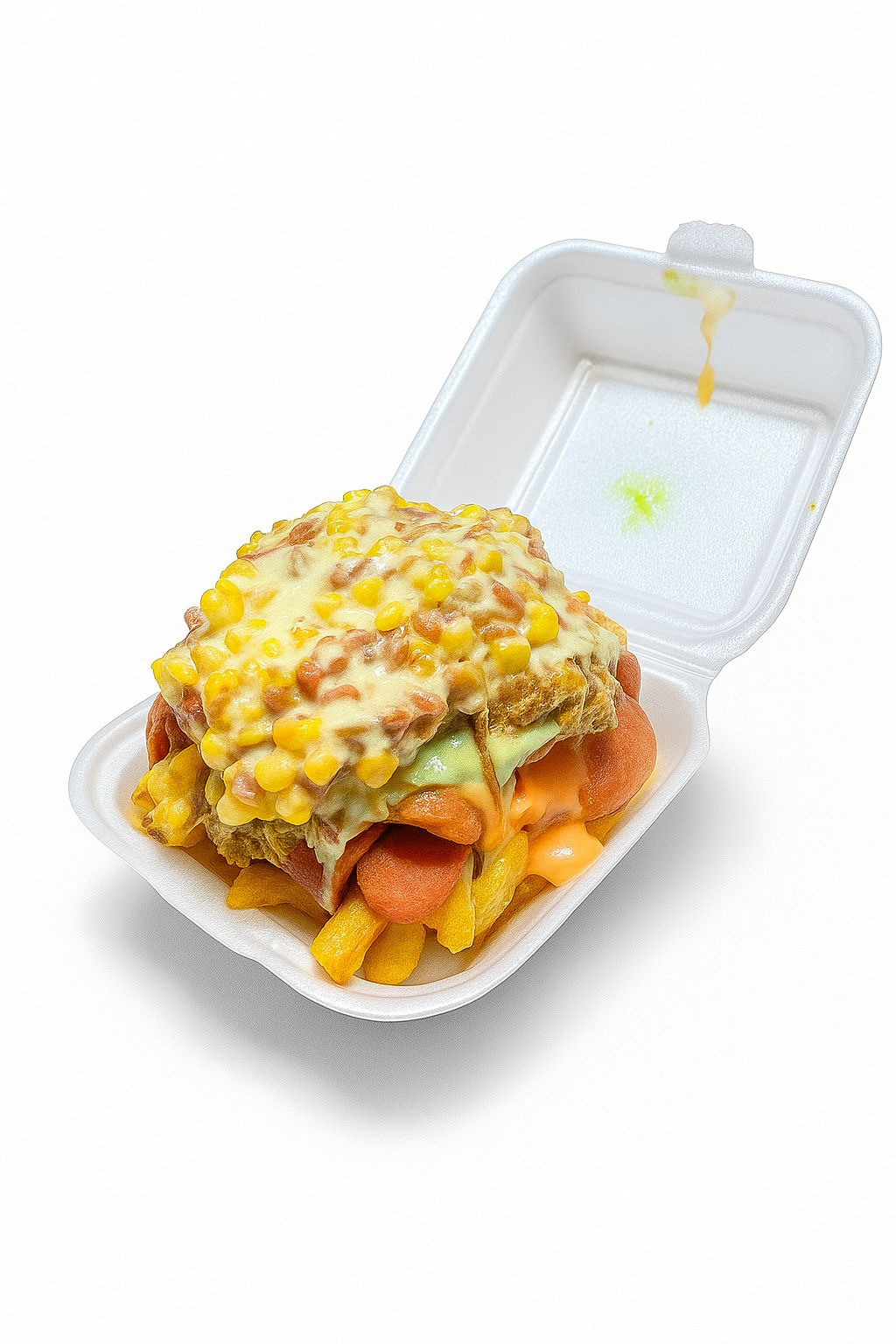 Salchicha, papas, tocineta, queso.